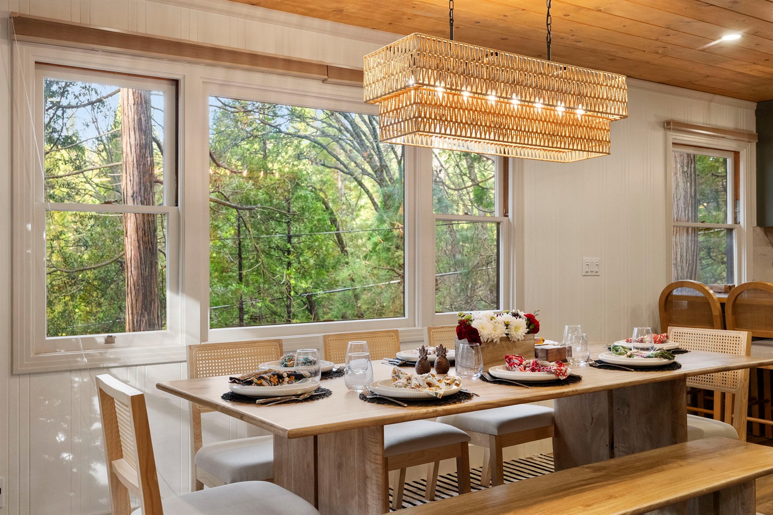 A large dining table set in front of expansive windows, bringing the forest indoors