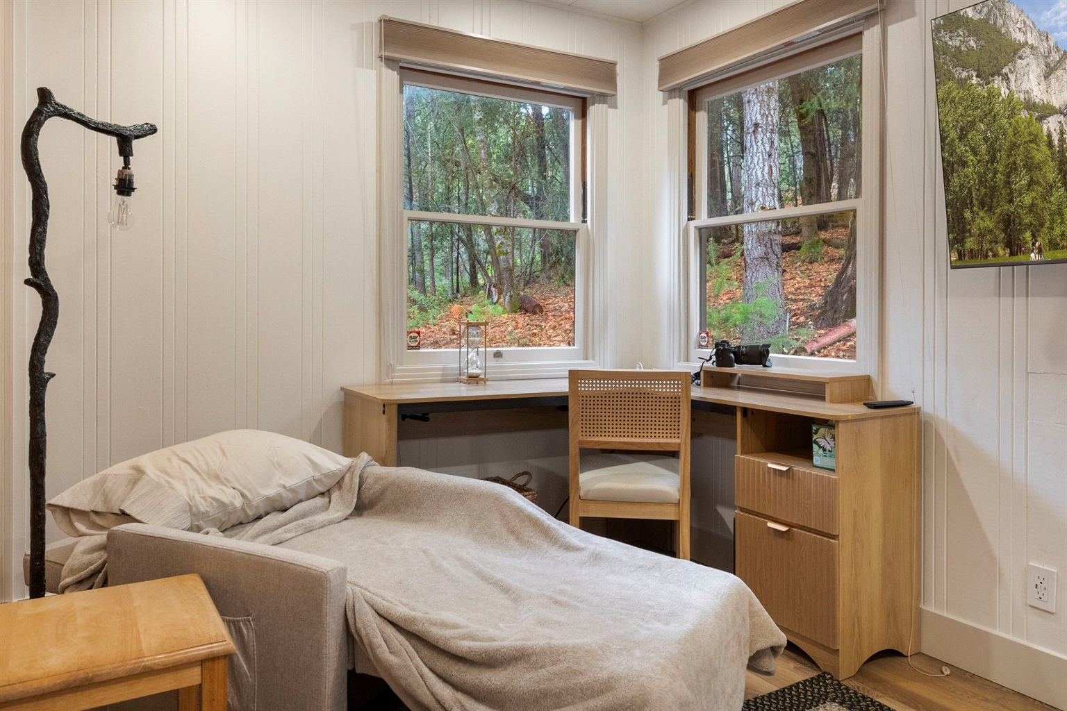A peaceful retreat with a queen bed, a chair that pulls out into a small bed, and a full desk positioned beneath large windows overlooking the trees — ideal for reading, journaling, or remote work.