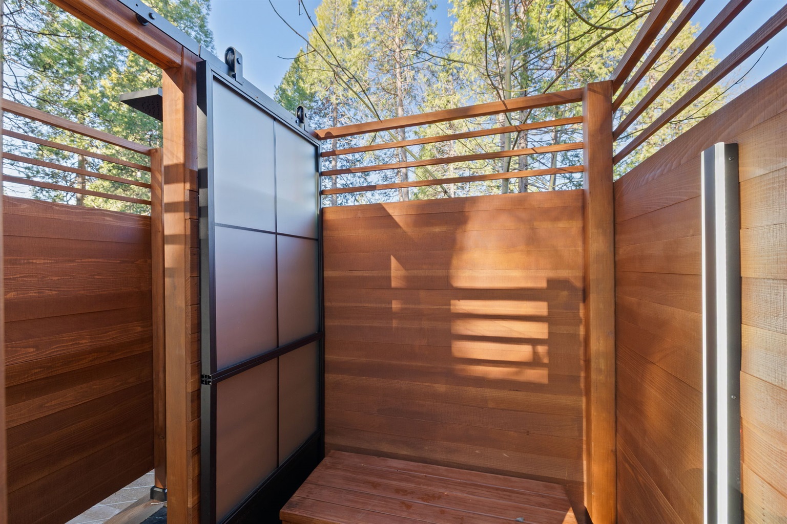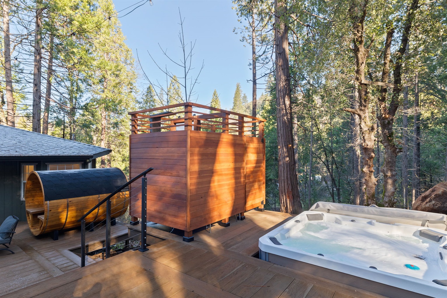 • Primary Master Suite — A beautifully remodeled retreat featuring a king bed, office desk with a work area facing the forest, double sinks, a large walk-in shower, and a magical custom-made wooden soaking bathtub for a spa-like experience.